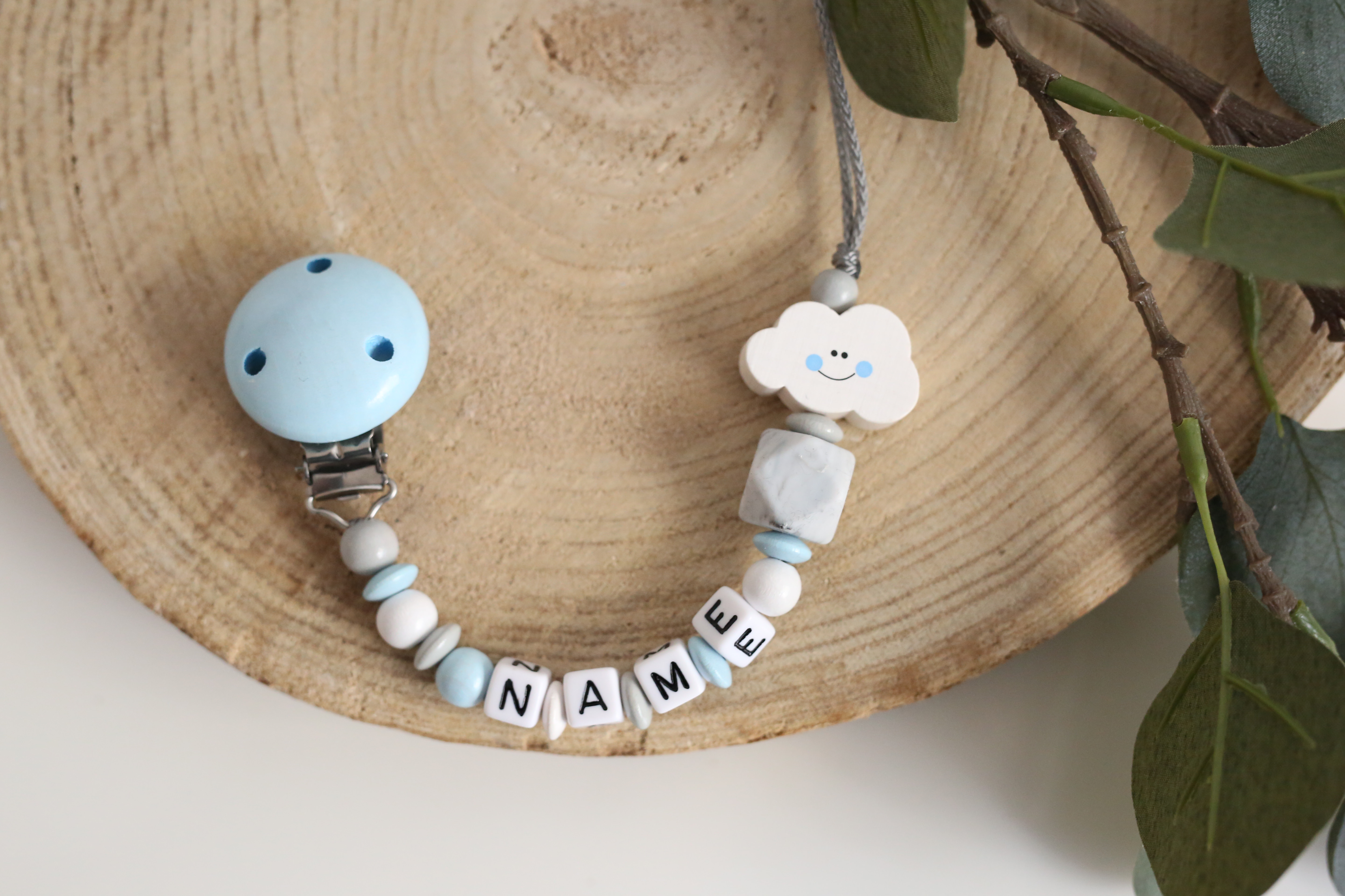 Unser Tipp: In unserem Schnullerketten Shop mit unserem neuen Schnullerkettenkonfigurator, kannst Du ganz nach Wunsch eine personalisierte Kette erstellen und Dir Clips, Motivperlen, Holzperlen sowie Silikonring nach Deinen eigenen Vorstellungen zusammenstellen. Auch der Baby Name lässt sich dank unserer Buchstabenwürfel auf der Kette festhalten. Das ist ein Geschenk, das Dir so schnell keiner nachmacht. Probiere unseren Schnullerketten Konfigurator doch auch mal aus!